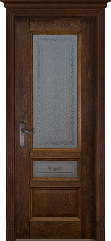 Дверное полотно из массива ольхи. В стоимость входит дверное полотно, коробка без порога и наличники на две стороны, стекло с рисунком. Дополнительно дверь может комплектоваться телескопическими наличниками, наличниками с канелюрами, декоративными карнизами (коронами), розетками (квадратиками) и цоколями. Возможные размеры 2000*900,800,700,600.