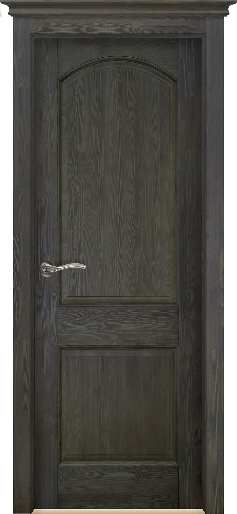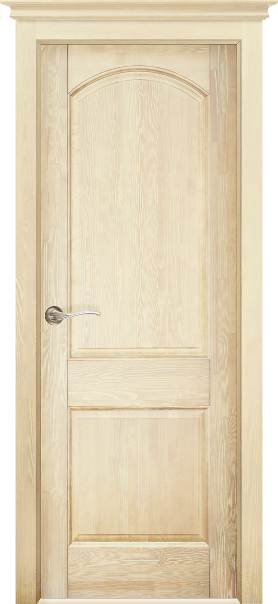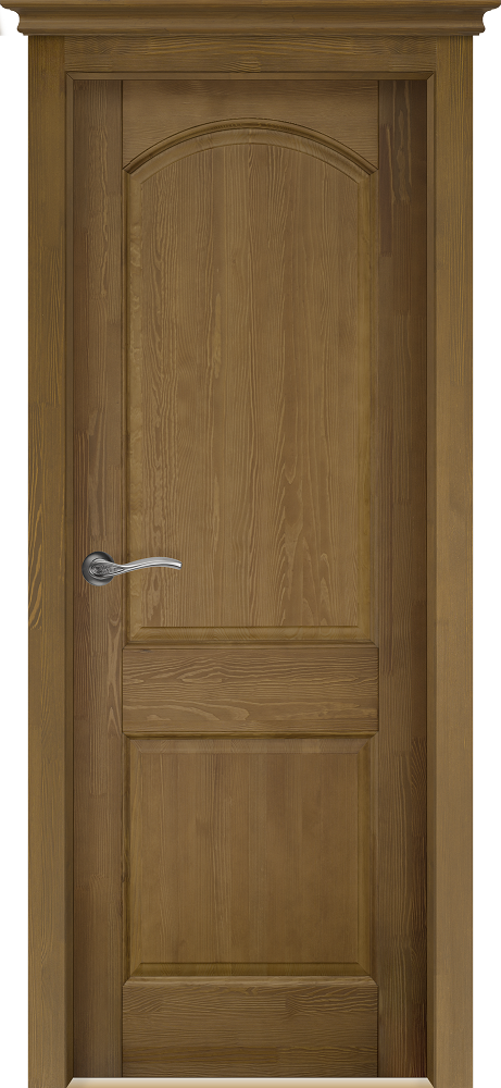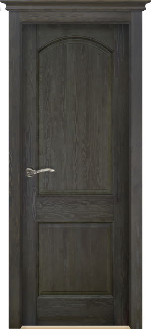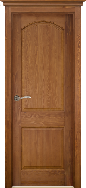 Массив сосны проходит обработку специальными металлическими щетками, которые выбирают из прожил мягкую древесину, тем самым выражая структуру древесины. Затем детали дверей покрываются красителем и полиуретановым лаком. Дополнительно дверь может комплектоваться декоративными карнизами (коронами). Возможные размеры 2000*900,800,700,600.